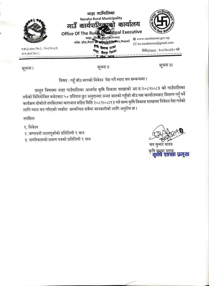 गहुँ बीउको लागि निवेदन पेश गर्ने सम्बन्धमा ।
