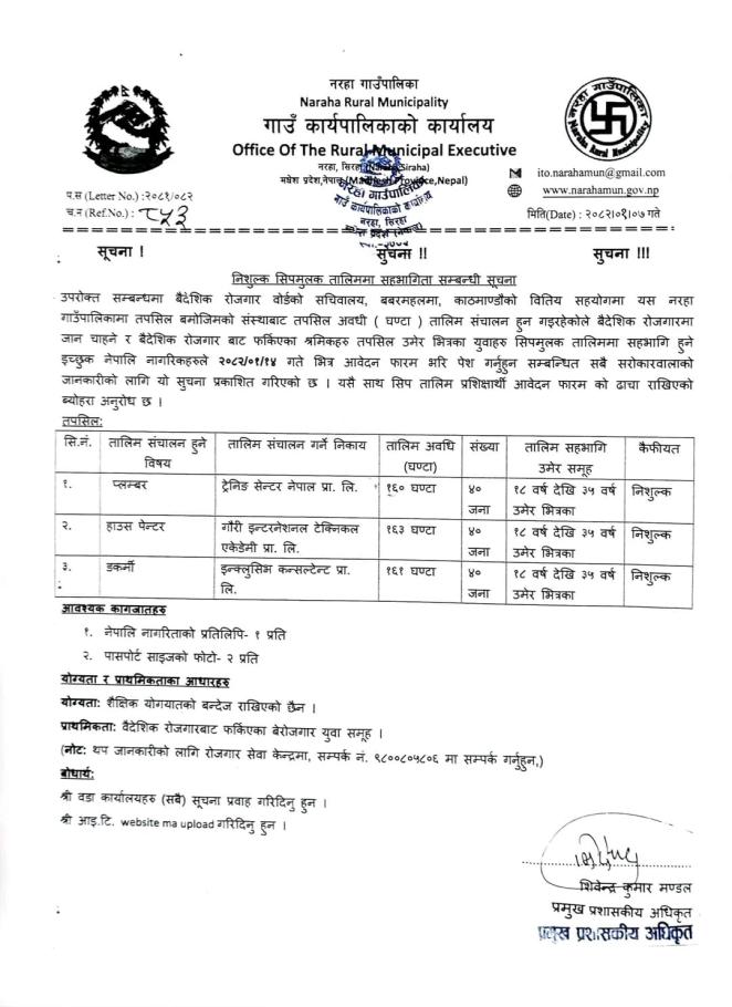 » नि:शुल्क सिपमुलक तालिम सम्बन्धी सूचना ।